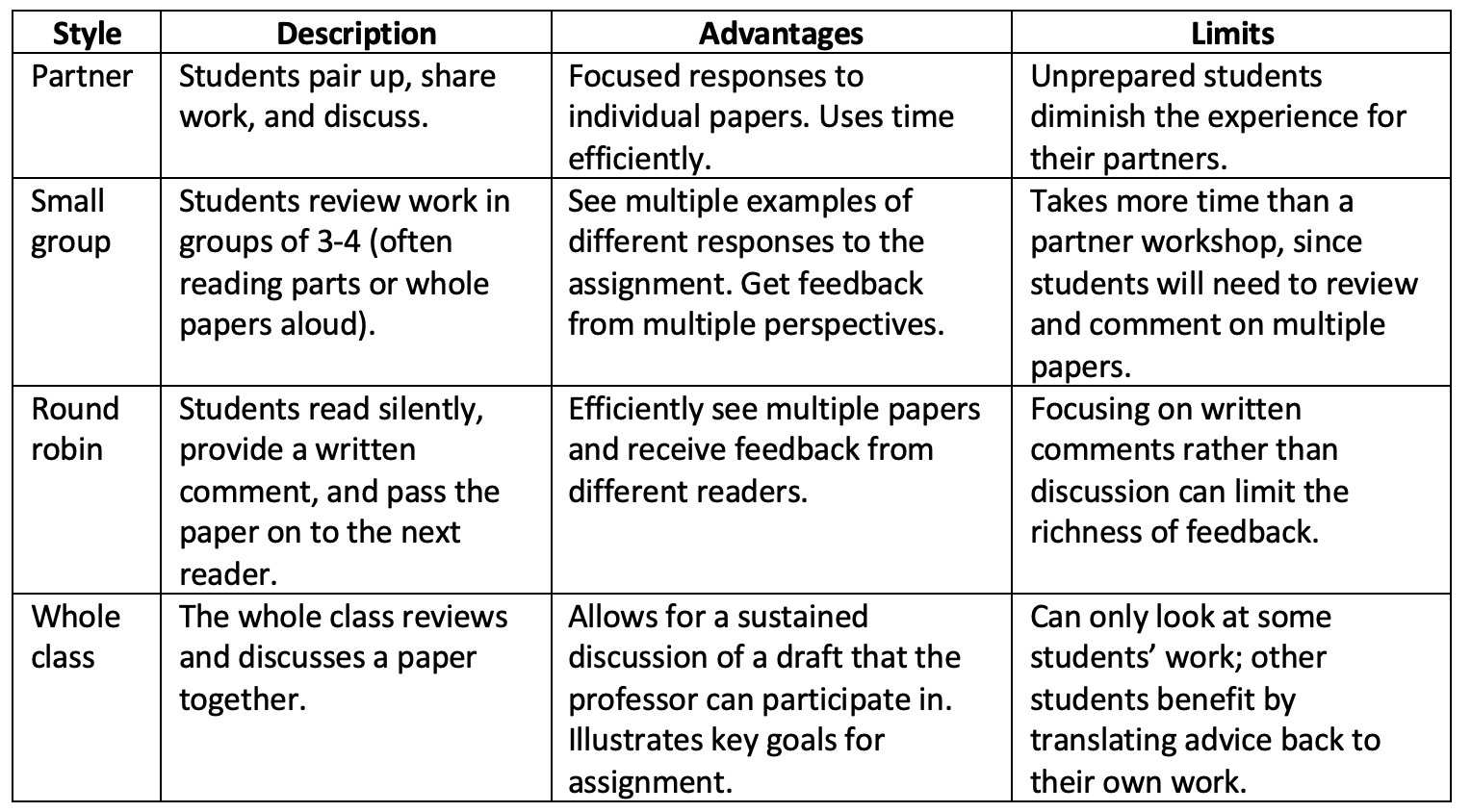 - The classic small group workshop. Students in groups of 2-4 exchange papers and read and respond to entire drafts. Provide a structured timeline for students for how to organize the time so that everyone receives ample feedback.